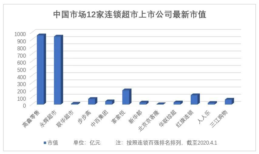 4月11日收盘,公司股价1.14港元/股,下跌0.87%,市值12.76亿港元,折算成人民币为11.68亿元,与同为连锁超市十强的高鑫零售(大润发母公司)和永辉超市相差80倍,在中国12家连锁超市上市公司中排名倒数第二。